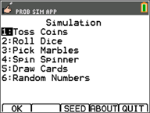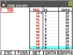 Ett mynt kastas. Tryck nu +1, +10 eller +50 beroende på vilka data du vill samla in. Frekvensgrafen uppdateras varje gång som myntet kastas. Tryck <ESC> när du är klar med simuleringen. |