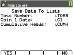 Tryck på DATA för att lagra dessa data i listor, som sedan kan användas i listeditorn. Värdena 0 för klave och 1 för krona lagras i listan LC1. |