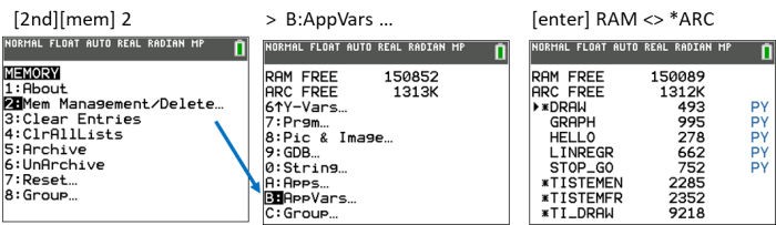 Python App har en File Manager, en Editor för att skapa program och ett Shell-gränssnitt för att köra program och växelverka med Python-tolken. Python-program lagrade eller skapade som Python AppVars exekveras från RAM. Du kan lagra Python AppVars i Archive för minneshantering y L 2:. Om skärmen File Manager i Python App inte visar något av dina PY AppVar-program kan du flytta ett Python-program PY AppVar mellan RAM- eller Archive-minne så som visas. * betecknar en fil i Archive. Tryck på [enter] för att flytta en fil mellan RAM och Archive.