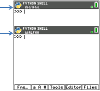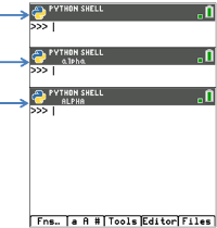 | • | För att avbryta ett Python-program som körs i Shell-gränssnittet, t.ex. när ett program är i en kontinuerlig loop, tryck på É. Tryck på [Tools] (q) > 6:New Shell som en alternativ metod till att stoppa ett program som körs. |