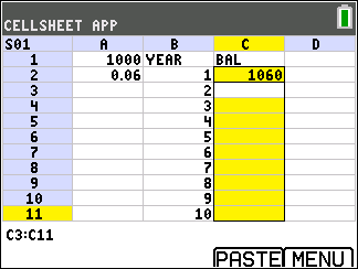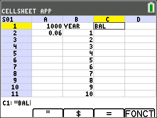 Press the } and ~ keys to scroll to cell C1 and type “BAL (using the ƒ key, or Alpha Lock y 7, as needed).