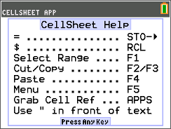 L’écran d’aide s’affiche. Les touches de fonction activent les fonctionnalités de la feuille de calcul (sélectionnez Plage, Couper, Copier, Coller et Menu). Les touches ¿ et K sont remplacées afin de fournir un accès rapide aux caractères courants des feuilles de calcul (= pour commencer une formule, $ pour ajouter une référence absolue).