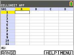 Appuyez sur n’importe quelle touche pour afficher la feuille de calcul. La ligne de saisie avec la référence de cellule s’affiche sur le côté gauche. La touche de fonction Menu s’affiche au-dessus de la touche [F5], comme indiqué dans l’écran d’aide CellSheet. |