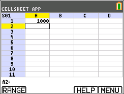 Faites défiler l’écran jusqu’à la cellule A1. Appuyez sur [enter]. Le curseur est activé sur la ligne de saisie et la touche de fonction disparaît afin que vous puissiez utiliser la ligne de saisie complète. |