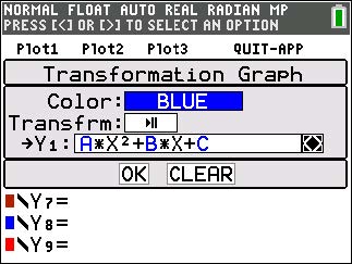 L'application Transformation Graphing (Étude graphique des transformations de courbes) optimise le mode de fonction o et vous permet d'observer les effets de la modification des valeurs des coefficient sans quitter l'écran graphique. La fonction de transformation est uniquement disponible en mode fonction (z).