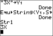 Equ4String( zet een vergelijking om in een string. De vergelijking moet worden opgeslagen in een VARS Y-VARS-variabele. Yn bevat de vergelijking. Strn (van Str1 tot en met Str9 of Str0) is de stringvariabele waarin u wilt dat de vergelijking wordt opgeslagen.