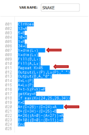 Waar zijn de extra spaties? U kunt extra spaties in uw programma zien met de TI Connect™ CE Program Editor, door het gehele programma te selecteren. Extra spaties aan het eind van commandoregels moeten verwijderd worden voordat het programma naar de rekenmachine wordt verzonden. |