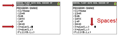 Extra spaties kunnen een syntax-fout veroorzaken bij het uitvoeren van een programma op de rekenmachine.