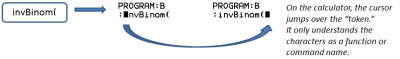 Wanneer een commando een token op de rekenmachine is, dan staat de cursor op het eerste teken en springt vervolgens over het commando heen als een token. Als de cursor letter voor letter door een commando beweegt, dan is dat commando niet omgezet. Verwijder en plak het commando van de rekenmachine.
