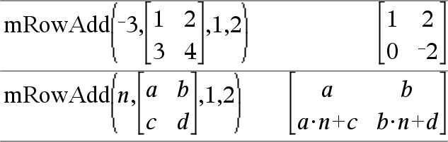 mRowAdd(Ausdr, Matrix1, Index1, Index2) ÞMatrix Gibt eine Kopie von Matrix1 zurück, wobei jedes Element in Zeile Index2 von Matrix1 ersetzt wird durch: