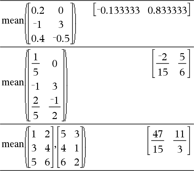 mean(Matrix1[, Häufigkeitsmatrix]) ÞMatrix Ergibt einen Zeilenvektor aus den Mittelwerten aller Spalten in Matrix1. Jedes Häufigkeitsmatrix-Element gewichtet die Elemente von Matrix1 in der gegebenen Reihenfolge entsprechend. Leere (ungültige) Elemente werden ignoriert. Weitere Informationen zu leeren Elementen finden Sie (hier). |