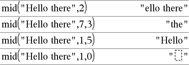 mid(Quellliste, Start [, Anzahl])ÞListe Gibt Anzahl Elemente aus Quellliste ab dem Element mit der Nummer Start zurück. Wird Anzahl weggelassen oder ist sie größer als die Dimension von Quellliste, werden alle Elemente von Quellliste ab dem Element mit der Nummer Start zurückgegeben. Anzahl muss | 0 sein. Bei Anzahl = 0 wird eine leere Liste zurückgegeben. |