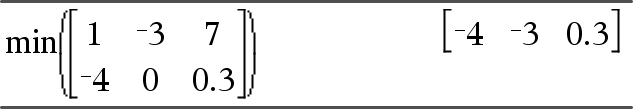min(Matrix1)ÞMatrix Gibt einen Zeilenvektor zurück, der das kleinste Element jeder Spalte von Matrix1 enthält. Hinweis: Siehe auch |