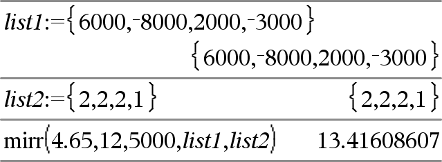 mirr(Finanzierungsrate,Reinvestitionsrate,CF0,CFListe[,CFFreq]) Finanzfunktion, die den modifizierten internen Zinsfluss einer Investition zurückgibt. Finanzierungsrate ist der Zinssatz, den Sie für die Cash-Flow-Beträge zahlen. Reinvestitionsrate ist der Zinssatz, zu dem die Cash-Flows reinvestiert werden. CF0 ist der Anfangs-Cash-Flow zum Zeitpunkt 0; dies muss eine reelle Zahl sein. CFListe ist eine Liste von Cash-Flow-Beträgen nach dem Anfangs-Cash-Flow CF0. CFFreq ist eine optionale Liste, in der jedes Element die Häufigkeit des Auftretens für einen gruppierten (fortlaufenden) Cash-Flow-Betrag angibt, der das entsprechende Element von CFListe ist. Der Standardwert ist 1; wenn Sie Werte eingeben, müssen diese positive Ganzzahlen < 10.000 sein. Hinweis: Siehe auch irr(), hier. |