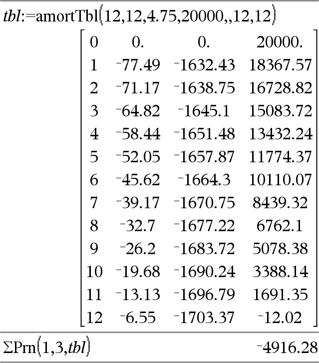 valorRedondo especifica el número de lugares decimales para el redondeo. Predeterminado=2. GPrn(NPgo1,NPgo2,tablaAmort) calcula la suma del interés con base en la tabla de amortización tablaAmort. El argumento tablaAmort debe ser una matriz en la forma descrita bajo amortTbl(), aquí. Nota: Vea también GInt(), arriba y Bal(), aquí. |