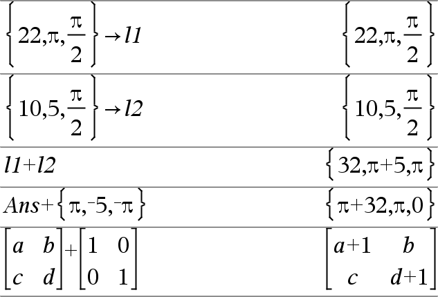 Lista1 + Lista2Þlista Matriz1 + Matriz2Þmatriz Entrega una lista (o matriz) que contiene las sumas de los elementos correspondientes en Lista1 y Lista2 (o Matriz1 y Matriz2). Las dimensiones de los argumentos deben ser iguales. |