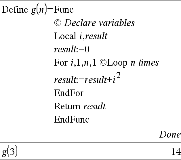 © [texto] © procesa texto como una línea de comentario, lo que le permite anotar funciones y programas que usted crea. © puede estar al comienzo y en cualquier parte en la línea. Todo a la derecha de ©, al final de la línea, es el comentario. Nota para introducir el ejemplo: Para obtener instrucciones sobre cómo introducir las definiciones de programas y funciones en varias líneas, consulte la sección Calculadora de la guía del producto. |
