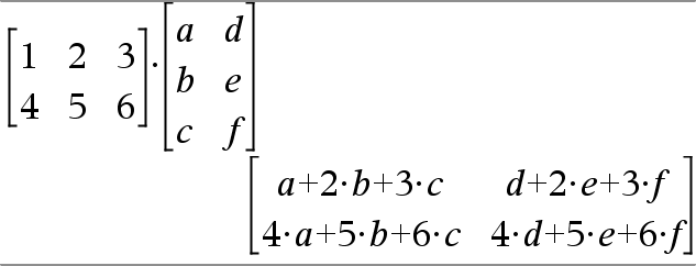 Matriz1 ·Matriz2Þmatriz Entrega el producto de la matriz de Matriz1 y Matriz2. El número de columnas en Matriz1 debe igualar el número de filas en Matriz2. |