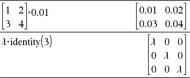 Matriz1 ·ExprÞmatriz Entrega una matriz que contiene los productos de Expr y cada elemento en Matriz1. Nota: Use .·(punto multiplicar) para multiplicar una expresión por cada elemento. |