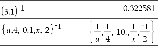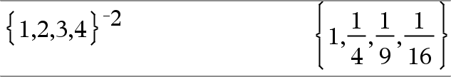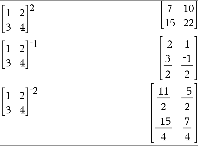 matrizCuadrada1 ^ entero Þ matriz Entrega matrizCuadrada1 elevada a la potencia del entero . matrizCuadrada1 debe ser una matriz cuadrada. Si entero = L1, resuelve la matriz inversa. Si entero < L1, resuelve la matriz inversa a una potencia positiva apropiada. |