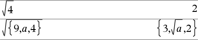 ‡ (Lista1)Þlista Entrega la raíz cuadrada del argumento. Para una lista, entrega las raíces cuadradas de todos los elementos en Lista1. Nota: Usted puede insertar esta función desde el teclado al escribir sqrt(...). Nota: Vea también Plantilla de raíz cuadrada, aquí. |