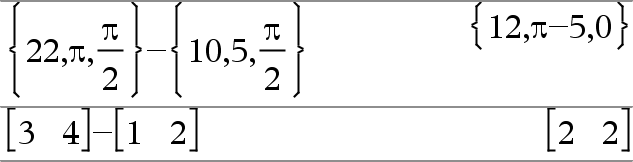 Lista1 N Lista2Þlista Matriz1 N Matriz2Þmatriz Sustrae a cada elemento en Lista2 (o Matriz2) del elemento correspondiente en Lista1 (o Matriz1) y entrega los resultados. Las dimensiones de los argumentos deben ser iguales. |