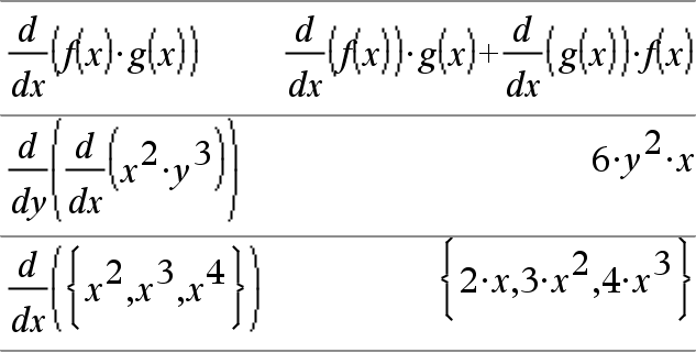 d(Expr1, Var[, Orden])Þexpresión d(Lista1, Var[, Orden])Þlista d(Matriz1, Var[, Orden])Þmatriz Entrega la primera derivada del primer argumento con respecto de la variable Var. Orden, si se incluye, debe ser un entero. Si el orden es menor que cero, el resultado será una antiderivada. Nota: Usted puede insertar esta función desde el teclado al escribir