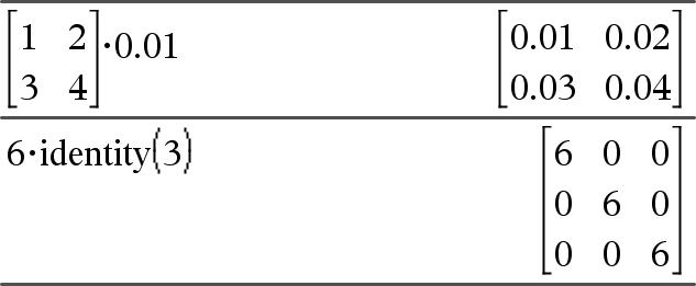Määrittää matriisin, joka sisältää Arvon ja kunkin Matriisi1:n elementin tulon. Huomaa: Käytä merkintää .·(piste kerro), kun haluat kertoa lausekkeen jokaisella elementillä. |