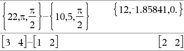 Lista1 N Lista2Þlista Matriisi1 N Matriisi2Þmatriisi Vähentää Lista2:n (tai Matriisi2:n) jokaisen elementin Lista1:n (tai Matriisi1:n) vastaavasta elementistä ja antaa tuloksena vastaukset. Argumenttien tulee olla mitoiltaan samanlaisia. |