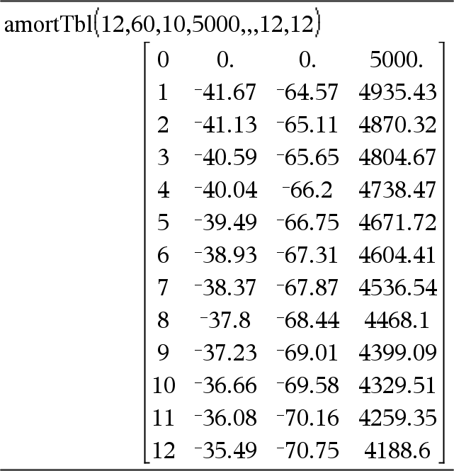 amortTbl(NPmt,N,I,PV, [Pmt], [FV], [PpY], [CpY], [PmtAt], [pyörArvo])Þmatriisi Lainan lyhennysfunktio, joka laskee lyhennystaulukon tiettyjen TVM-argumenttien perusteella. NPmt on taulukon maksuerien lukumäärä. Taulukko alkaa ensimmäisestä maksuerästä. N, I, PV, Pmt, FV, PpY, CpY ja PmtAt on kuvattu TVM-argumenttien taulukossa, täältä.