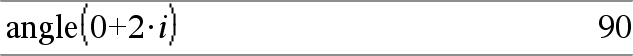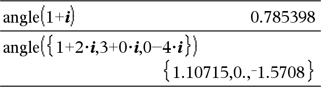 angle(Lista1)Þlista Laskee listan tai matriisin Lista1:n tai Matriisi1:n elementtien kulmista tulkiten jokaisen elementin kompleksiluvuksi, joka edustaa kaksiulotteista suorakulmakoordinaattipistettä. |