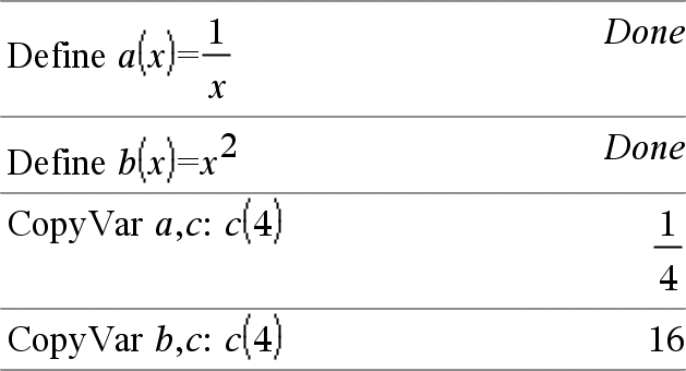 CopyVar Muutt1, Muutt2 CopyVar Muutt1., Muutt2. CopyVar Muutt1, Muutt2 kopioi muuttujan Muutt1 arvon muuttujaan Muutt2 ja luo tarvittaessa Muutt2:n. Muuttujalla Muutt1 on oltava arvo. Jos Muutt1 on olemassa olevan käyttäjän määrittämän funktion nimi, kopioi kyseisen funktion määrityksen funktioon Muutt2. Funktio Muutt1 on määritettävä. Muutt1:n on oltava muuttujien nimeämissääntöjen mukainen tai epäsuora lauseke, joka sieventyy näitä vaatimuksia vastaavaksi muuttujan nimeksi. |