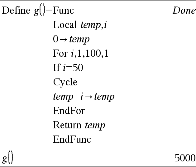 Cycle Siirtää ohjauksen välittömästi nykyisen silmukan (For, While tai Loop) seuraavaan iteraatioon. Cycle ei ole sallittu näiden kolmen silmukkarakenteen (For, While tai Loop) ulkopuolella. Huomaa esimerkkiä syöttäessäsi: Ohjeet monirivisten ohjelmien ja funktion määritysten syöttämisestä löytyvät tuotteen ohjekirjan Laskin-osiosta. |
