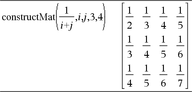 constructMat(Laus,Muutt1,Muutt2,numRivit,numSarakkeet) Laskee matriisin argumentteihin perustuen. Laus on lauseke muuttujissa Muutt1 ja Muutt2. Tuloksena olevan matriisin elementit muodostetaan sieventämällä Laus jokaisella Muutt1:n ja Muutt2:n lisätyllä arvolla. Muutt1:ä lisätään automaattisesti välillä 1 - numRivit. Kullakin rivillä Muutt2:a lisätään välillä 1 - numSarakkeet. |