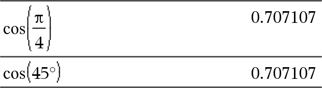 cos(Lista1) määrittää listan kaikkien Lista1:n sisältämien elementtien kosineista. Huomaa: Argumentti tulkitaan aste-, graadi- tai radiaanikulmaksi käytössä olevan kulmatila-asetuksen mukaisesti. Voit ohittaa kulmatilan väliaikaisesti painikkeilla ¡, G tai R. |
