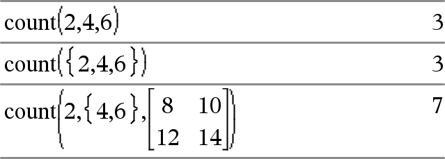 count(Arvo1taiLista1 [,Arvo2taiLista2 [,...]])Þarvo Laskee elementtien kokonaismäärän argumenteille, jotka sieventyvät numeroarvoiksi. Argumentit voivat olla lausekkeita, arvoja, listoja tai matriiseja. Argumenttien datatyypit voivat olla erilaisia, ja argumentit voivat olla erikokoisia. Listan, matriisin tai solualueen jokainen elementti sievennetään, jotta voidaan määrittää, kuuluuko se laskettavaan lukumäärään. Listat & Taulukot -sovelluksessa voit käyttää solualueita argumenttien tilalla. Tyhjiä elementtejä ei huomioida. Lisätietoja tyhjistä elementeistä, katso täältä. |