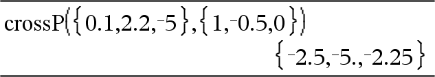 crossP(Vektori1, Vektori2)Þvektori Laskee rivi- tai sarakevektorin (argumenteista riippuen), joka on Vektori1:n ja Vektori2:n ristitulo. Sekä Vektori1:n että Vektori2:n on oltava rivivektoreita tai sarakevektoreita. Vektoreiden on oltava samankokoiset, ja koon tulee olla joko 2 tai 3. |