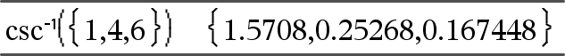 csc/(Arvo1) Þ arvo csc/(Lista1) Þ lista Laskee kulman, jonka kosekantti on Arvo1, tai määrittää listan, joka sisältää Lista1:n kunkin elementin käänteiskosekantit. Huomaa: Vastaus lasketaan aste-, graadi- tai radiaanikulmana käytössä olevan kulmatila-asetuksen mukaisesti. Huomaa: Voit syöttää tämän funktion näppäimistöltä kirjoittamalla arccsc(...). |