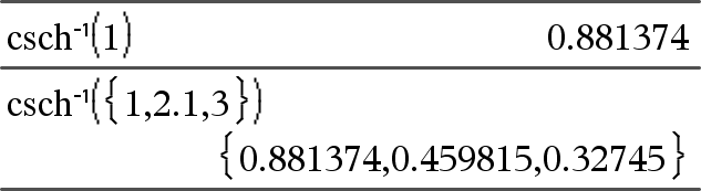 csch/(Arvo) Þ arvo csch/(Lista1) Þ lista Laskee Arvo1:n käänteisen hyperbolisen kosekantin tai määrittää listan, joka sisältää Lista1:n kaikkien elementtien käänteiset hyperboliset kosekantit. Huomaa: Voit syöttää tämän funktion näppäimistöltä kirjoittamalla arccsch(...). |