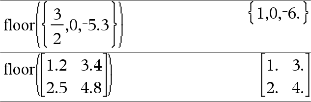 floor(Arvo1)Þkokonaisluku Laskee suurimman kokonaisluvun, joka on { argumentti. Tämä funktio on identtinen funktion int() kanssa. Argumentti voi olla reaali- tai kompleksiluku. |