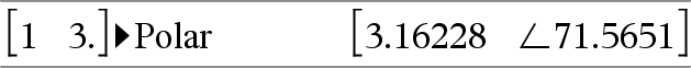 Vektori ►Polar Huomaa: Voit syöttää tämän operaattorin tietokoneen näppäimistöltä kirjoittamalla @>Polar. Näyttää vektorin polaarisessa muodossa [r ±q]. Vektorin on oltava kooltaan 2, ja se voi olla rivi tai sarake. Huomaa: ►Polar on näyttömuodon ohje, ei muunnosfunktio. Voit käyttää komentoa ainoastaan syöterivin lopussa, eikä se päivitä ans:n arvoa. Huomaa: Katso myös ►Rect, täältä. |
