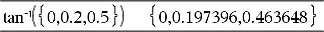 tan/(Lista1) luo listan Lista1:n jokaisen elementin käänteistangenteista. Huomaa: Vastaus lasketaan aste-, graadi- tai radiaanikulmana käytössä olevan kulmatila-asetuksen mukaisesti. Huomaa: Voit syöttää tämän funktion näppäimistöltä kirjoittamalla arctan(...). |