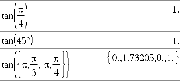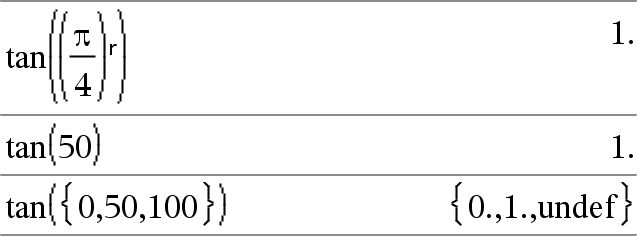 tan(Lista1) määrittää Lista1:n kaikkien elementtien tangenttien listan. Huomaa: Argumentti tulkitaan aste-, graadi- tai radiaanikulmaksi käytössä olevan kulmatilan mukaisesti. Voit ohittaa kulmatila-asetuksen väliaikaisesti käyttämällä merkintää ¡, G tai R. |