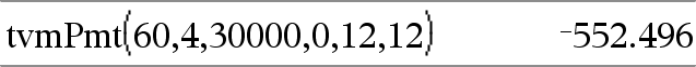 tvmPmt(N,I,PV,FV,[PpY],[CpY],[PmtAt])Þarvo Talouslaskentafunktio, joka laskee jokaisen maksuerän määrän. Huomaa: TVM-funktioissa käytetyt argumentit on kuvattu TVM-argumenttien taulukossa, täältä. Katso myös amortTbl(), täältä. |