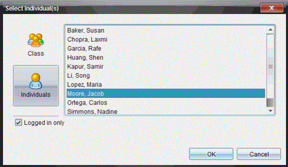 | • | Jos haluat näyttää yksittäisten opiskelijoiden näytöt, napsauta ja sen jälkeen kunkin opiskelijan nimeä. Voit valita useita opiskelijoita samalla kertaa pitämällä vaihto-näppäintä alhaalla. Jos haluat valita opiskelijoita satunnaisessa järjestyksessä pidä Ctrl-näppäintä painettuna (Mac®: “) ja napsauta jokaisen opiskelijan nimeä. |