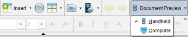 | ▶ | Halutessasi vaihtaa sivun esikatselua napsauta Asiakirjan esikatselu työkalupalkissa ja napsauta sitten Kämmenlaite tai Tietokone. |