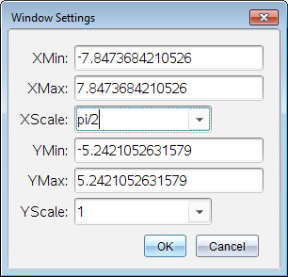 Vain Tarkka aritmetiikka ja CAS: Voit muuttaa valintamerkkimerkintöjä näyttämään piin kertoimia, radikaalilukuja tai muita tarkkoja arvoja muokkaamalla XScale- tai YScale-arvoja Ikkuna/Suurenna > Ikkunan asetukset -valintaikkunassa. Katso seuraava esimerkki.