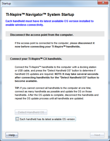 Kun asennat tai päivität TI‑Nspire™ CX Premium opettajan ohjelmistosta niin, että yhteyspiste on yhdistettynä tai kun kohta on valittuna, Käynnistys-valintaikkuna aukeaa, kun käynnistät ohjelmiston ensimmäistä kertaa. Sinun on päivitettävä kaikki opiskelijoiden ja luokan kämmenlaitteet uusimpaan käyttöjärjestelmään.
