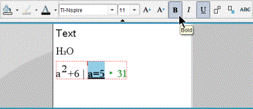 | • | Teksti matemaattisen lausekkeen ruudussa. Käytä muotoilua ja syötä matemaattiset eksponentit ja alaindeksit muuttujien nimille. Valitse kirjasin ja kirjasinkoko. Kirjasinkoko vaikuttaa koko ruudun tekstiin. |