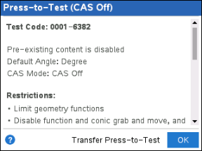Jo ennen Press-to-Test-tilaan siirtymistä voimassa olevat järjestelmän asetukset eivät siirry Press‑to‑Test-istuntoon. Sen sijaan siirtyessäsi ensimmäistä kertaa Press-to-Test-tilaan, järjestelmän asetukset asetetaan oletusarvoihinsa. Voit vaihtaa asetuksia Press-to-test -tilassa ollessasi. Kun poistut Press-to-test-tilasta, järjestelmäasetukset palautetaan niihin asetuksiin, jotka olivat voimassa ennen Press-to-test-tilaan siirtymistä.